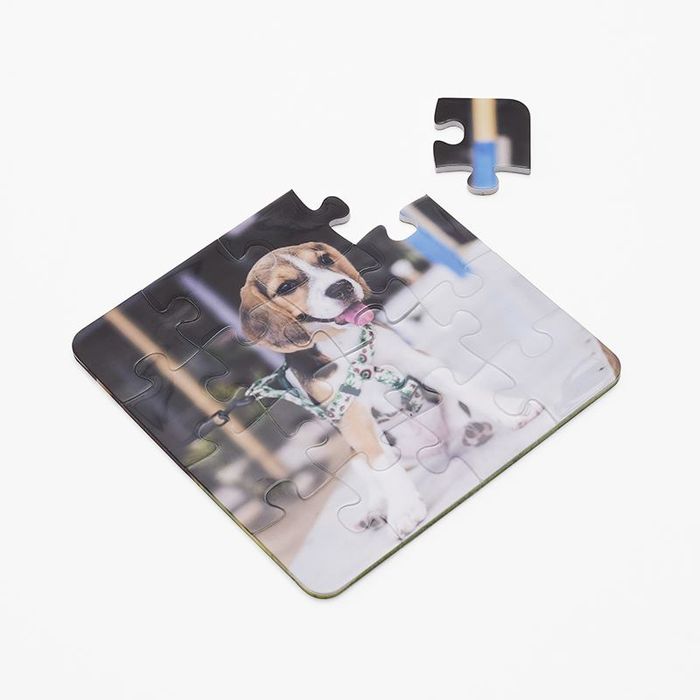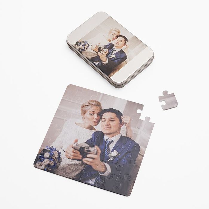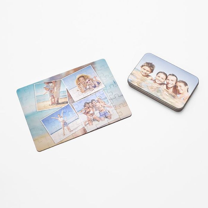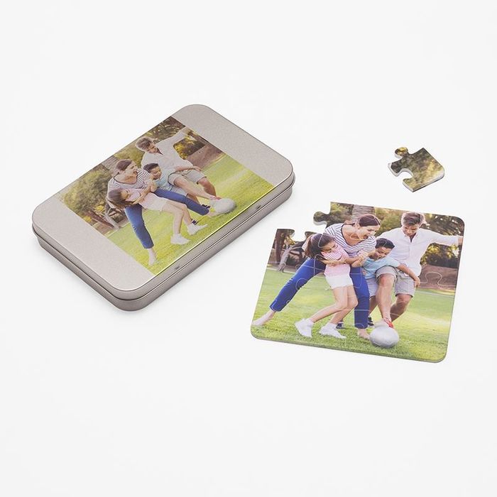 Your jigsaw puzzle is handmade to order in London, UK, ensuring it's a totally bespoke gift. When you design your own puzzle, thick, shatterproof plastic is moulded into shape and printed with your unique photos. Using a specialist process that fuses the inks deep into the surface, your designs are long-lasting and won't peel away or scratch off. The classic puzzle piece shape is cut precisely so that the pieces snap shut together in place perfectly. The same image that's printed onto the surface of your jigsaw is printed onto the lid of a silver metallic tin, for complementary presentation and a flawless finish.