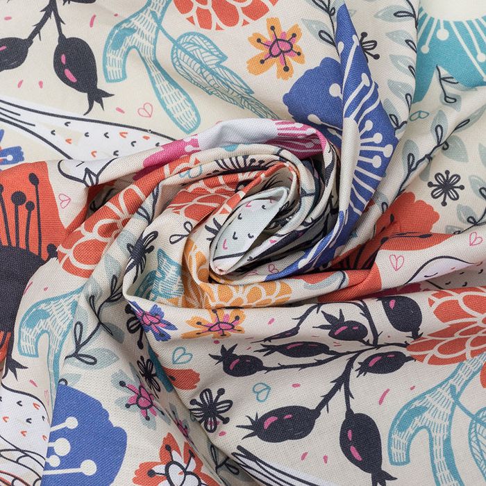 Medium weight, soft and non-stretch, matte and opaque, great for quilting. Muted colours on a warm cream coloured base.