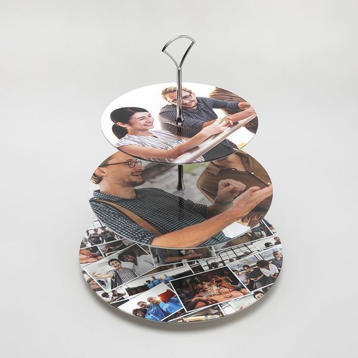 Each tier is printed with your unique photos or text to give your afternoon tea a bold statement and the silver stem adds a touch of elegance. At approximately 35 cm tall this neat personalised cake stand will look a picture on any kitchen worktop or dining table.