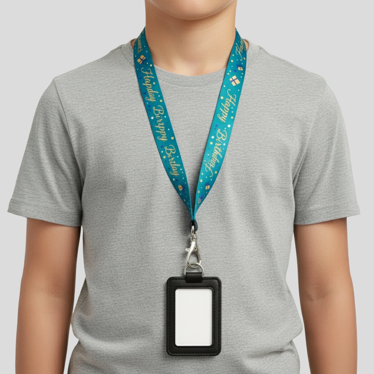 Each personalised lanyard is crafted in our UK studio using expert digital printing techniques that allow edge-to-edge colour accuracy. The satin ribbon is printed on both sides for a seamless design, then assembled with your choice of leather tab and metal clip. The optional leather card holder is sized to fit standard ID or credit card dimensions and slides easily into the lanyard’s attachment clip. Every component is quality checked before dispatch to ensure comfort, strength, and standout appearance.