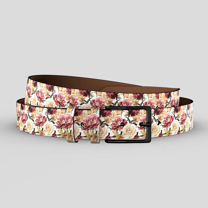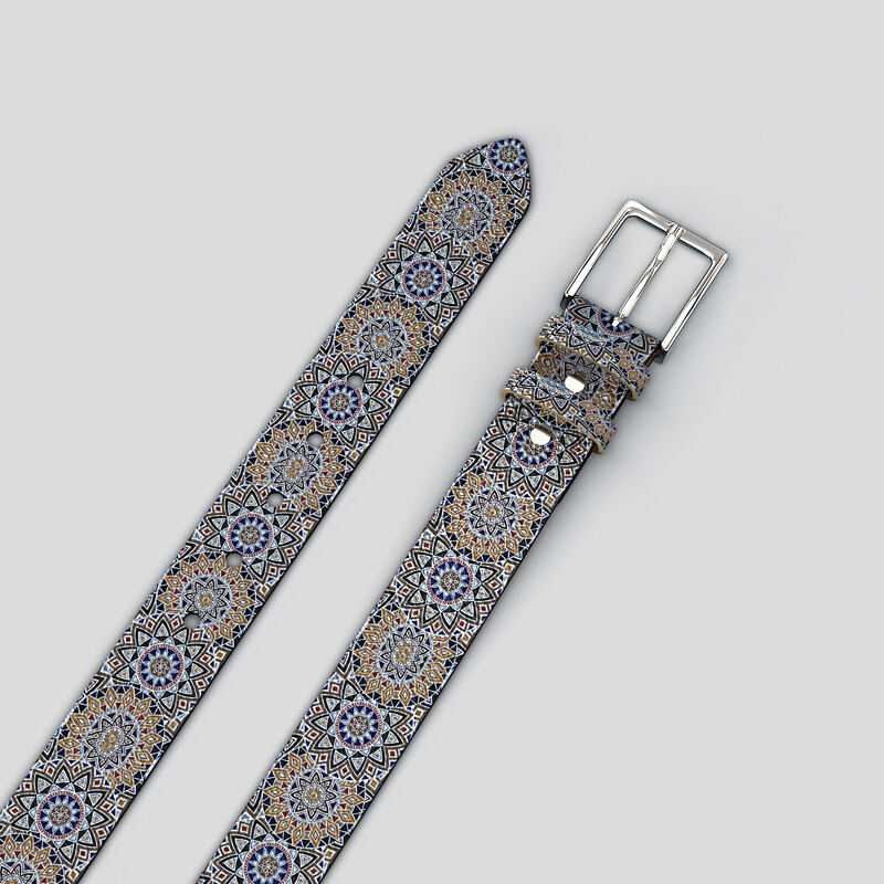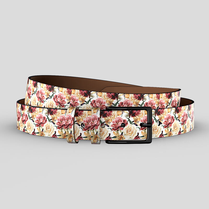 Create your design on the portion of the bespoke leather belts that are displayed, and then you can view the front and the back to make sure that you are happy with the repeat and the way that your final product will look. Your design will be printed on the belt itself as well as the loops. As it is a repeating pattern we advise that you select an image that isn't too small, as the design panel is on the smaller side. So make sure to select the perfect image(s) in order to guarantee you are satisfied with your beautiful new belt. We also recommend you double-check everything is scaled correctly to our rectangular measurements, especially if you want to avoid gaps in your seamless design.
