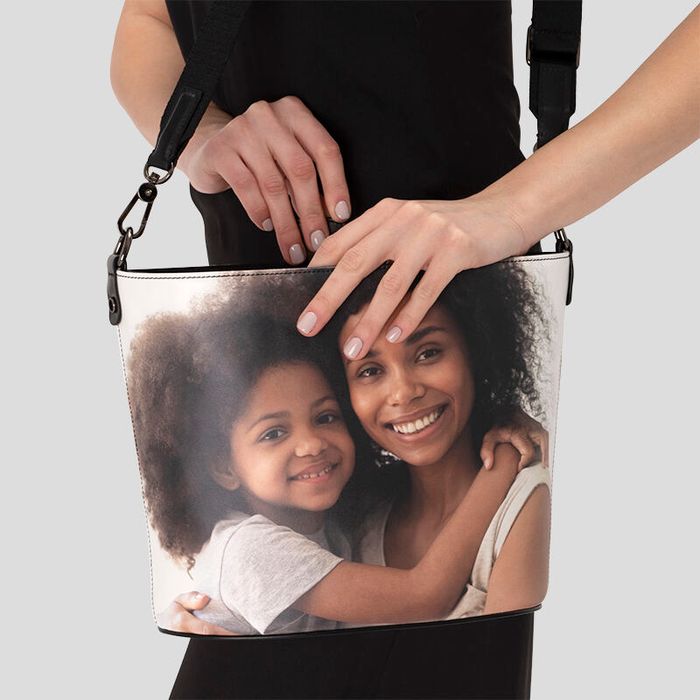 Photos and patterns work really well on your personalised leather bucket tote as there are 2 large design panels. We recommend that when you design your own shoulder bucket bag that you keep important details of your photo centralised as the design panel wraps around the sides of the bag. We also recommend that you pay close attention to the preview as when the bag is closed there is a curved shape that is created by the joining together of the tabs.