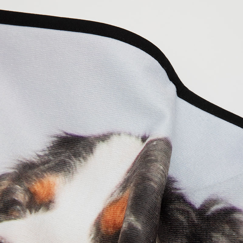 We use a highly technical material that combines modern microfibre and absorbent cotton terry towelling fabric. Due to its larger surface area the fabric of your personalised dog towel will absorb more water and dry in the blink of an eye. Printed directly onto the microfibre face using a specialist process that fuses the inks deep into the fibres, your personalised dog towel design won't crack or peel over time. The material is hand cut to size and a small hem is sewn at the edges, which is then bound with your choice of binding colour. Everything is finished by hand to guarantee a flawless finish and authentic, handmade feel.