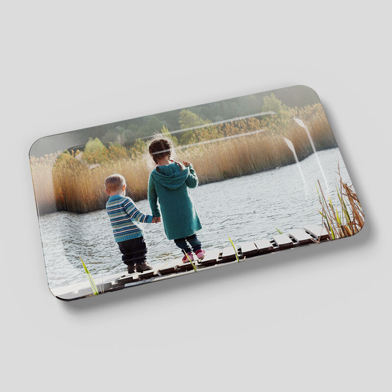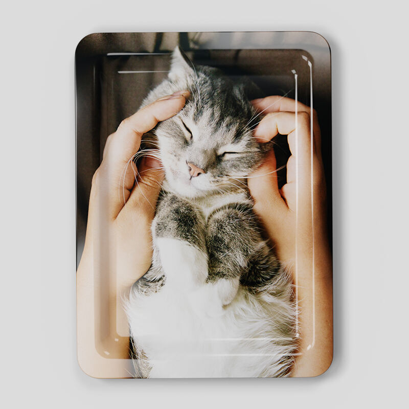 Care: the glossy surface is easily wiped with a damp cloth. Rinse and wipe by hand. Do not put your personalised dinner tray in the dishwasher. Because of our strong, tough print, we give a three-year guarantee on print, and product structure. If you're using as a tray table, we do not advise to use your tray for extremely hot dishes over 90°C. If you do so, the material will start to soften/distort. Cups of tea are of course, absolutely fine.These personalised photo trays are fantastic for various uses. Treat grandma to a lovely tray for the side table, ideal for holding keys, tickets or bus passes. They make great gifts as well. Transform your family’s dinner time with charming trays, customised for each person so there are no squabbles over whose tray is whose. Fathers, husbands, and brothers will appreciate a small photo tray for loose change, and the rest of the household will certainly enjoy not having to listen to coins jingling every time someone gets up!