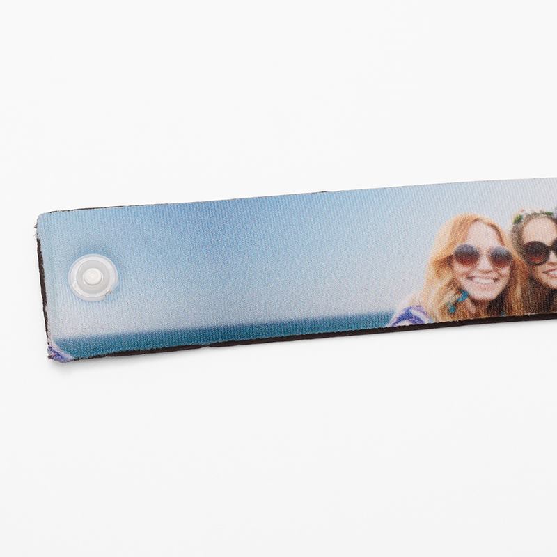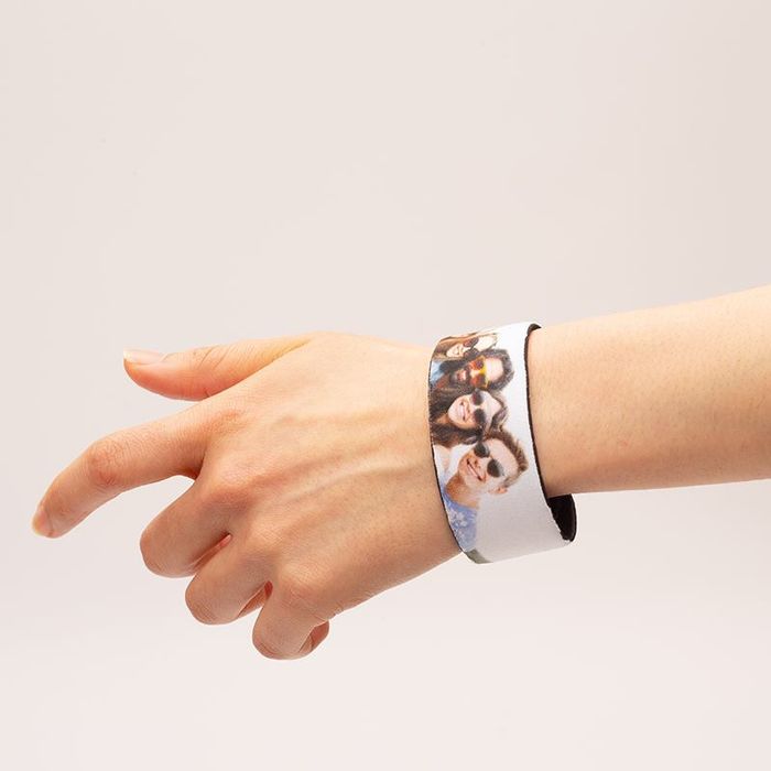 Custom wristbands are created by our team of skilled technicians and artisans, who work together to print your photos to perfection on the neoprene fabric, before cutting it to just the right size and shape. Neoprene is a lovely fabric, full of character and it has wonderful print qualities. Your photos will be printed with exceptional attention to detail, with fine lines and colours reproduced flawlessly. A press stud is added to ensure a comfortable and secure fit, and your wristband is complete.