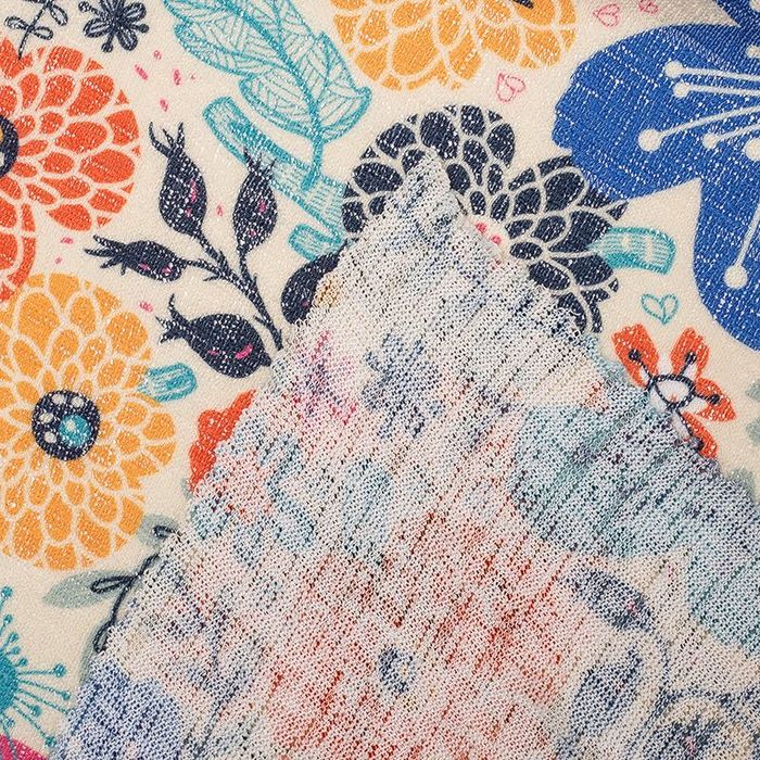 Light cream base colour, open plain weave. Airy, light, flowing. Soft yet strong. Super bright colours & deep blacks using reactive printing.