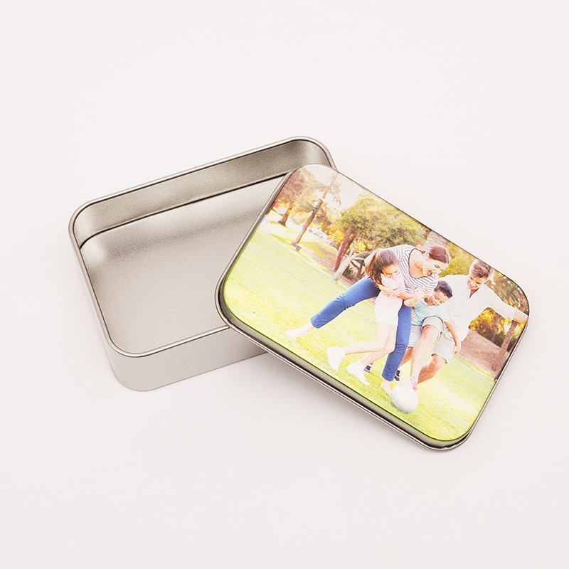 This useful, fancy little printed tin makes a neat and compact personalised photo gift.