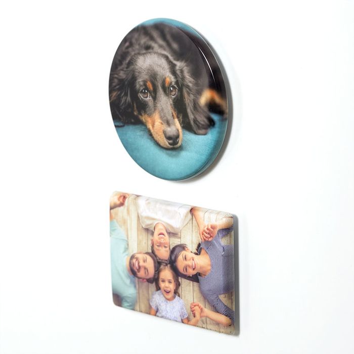 Turn any illustration, logo or photograph into fridge magnets with photos that tell a story. Mixing landscape and portrait shots works best on the rectangular option, while bold graphics pop on the circular shape. If you can’t decide, try our montage tool to create customised fridge magnets featuring up to two images or add text for dates and names.
