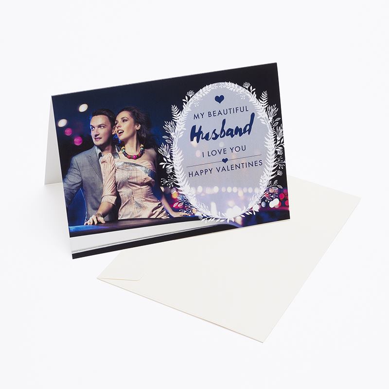 Make the Valentines day photo cards to make the day extra special. If you have never customised cards before you will find these personalised Valentines day cards fun and rewarding! You can get creative with your photo upload and design your Valentine's card using exclusive designer patterns for Valentine's Day. Add your own text to make unique Valentine's Card for boyfriend or girlfriend. You design, we print and send same day. We print using modern digital printing methods to ensure a lasting, full-colour print. Your card is cut to size by hand and supplied to you in a red envelope.