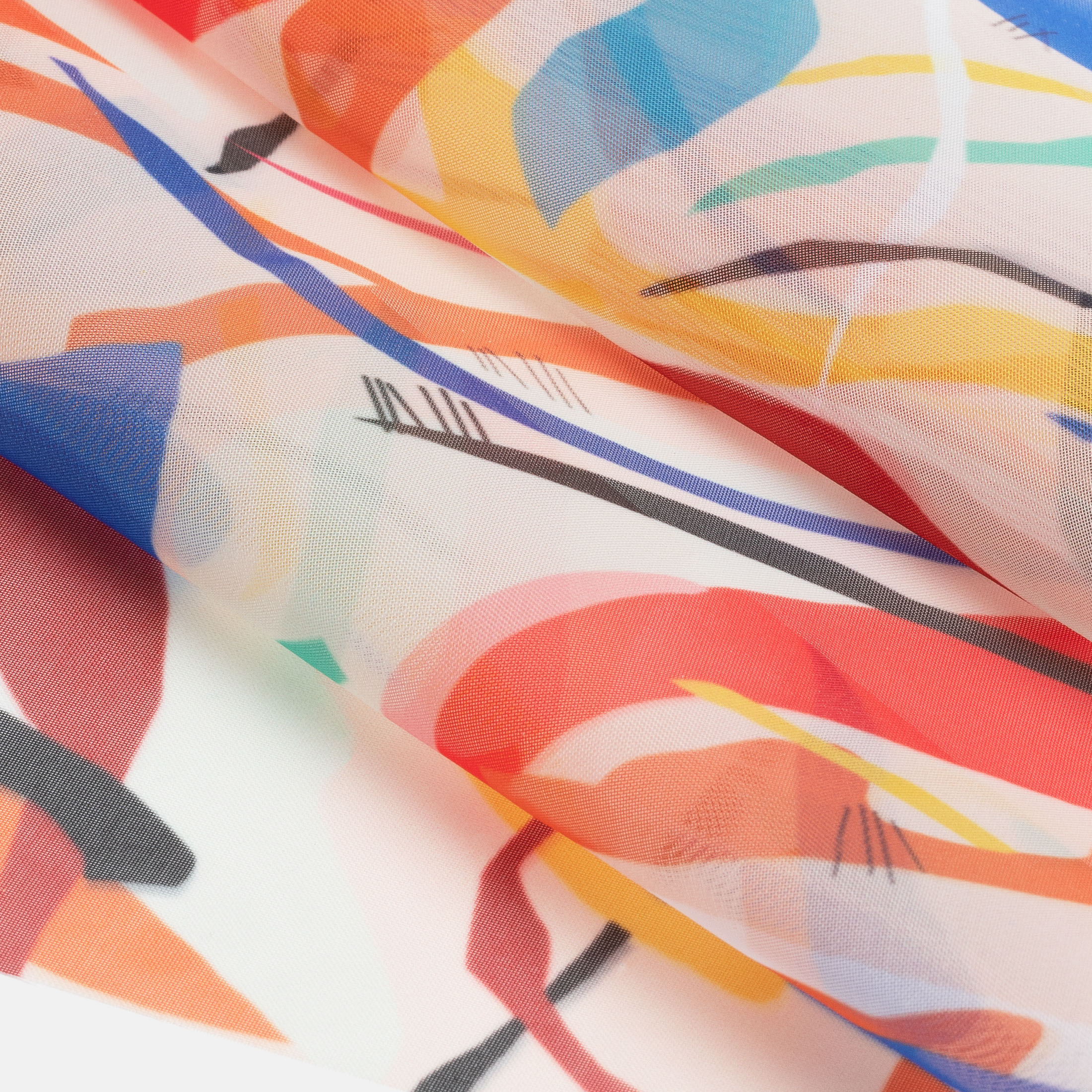 70% wool, 30% silk. Woven in Italy and finished in England. Light cream base colour, open plain weave. An airy, light, flowing, soft yet strong quality, Suitable for scarves and fashion. Super bright colours and deep blacks using reactive ink chemistry.