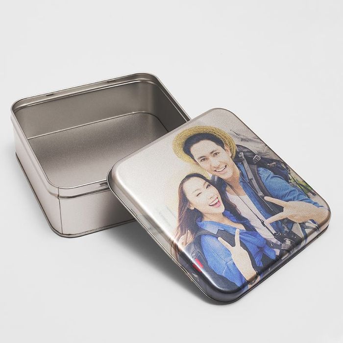 Please note that we do not print any white onto the surface before printing your photos, producing a natural, metallic finish showing the 'etched' like grains. If you want to create a vintage-inspired storage tin with an old sepia-toned photograph, this charming quality adds to the overall effect and brings authenticity to your design.