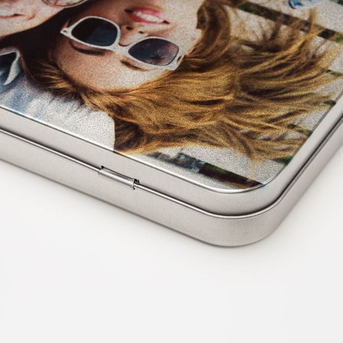 We print your design, photo, or text composition directly into the metal lid to make the personalised tin box.