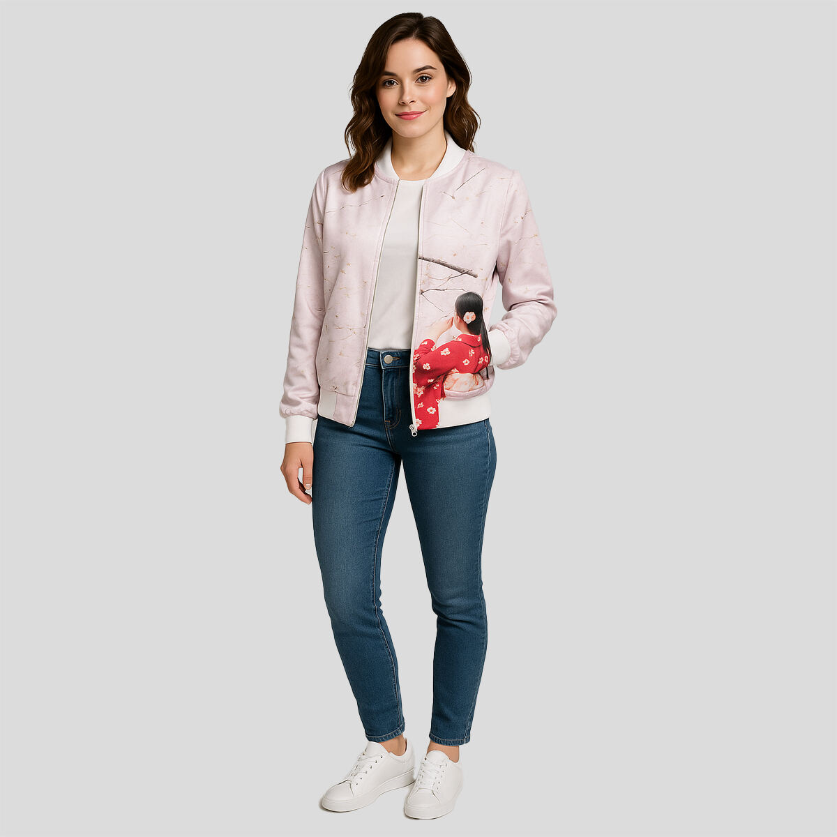 Each ladies reversible bomber jacket is handcrafted to order in our studio using state-of-the-art printing methods. Your designs are rendered in high-resolution colour across both sides of the jacket, then cut and stitched with care to ensure precise alignment and a flawless finish. We add a high-quality reversible zip and soft ribbed trims for that signature bomber shape. Every detail is considered from print accuracy to lasting comfort.