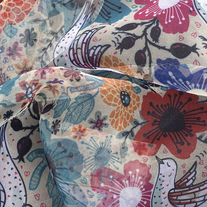 Stunning 100% real silk. Transparent and airy. Very light with a lovely drape and crepe texture. Available in high definition reactive printing, with wider colour depth and high wash allowance.